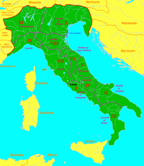 Na początku ustanowienia Cesarstwa Rzymskiego Italia składała się z terytoriów o różnym statusie. Niektóre miasta, jak np. municipii, posiadały pewną niezależność od Rzymu. Kolonie z kolei założone zostały przez samych Rzymian. Pełna organizacja Italii zakończyła się w I wieku p.n.e., około 7 roku p.n.e., kiedy to cesarz Oktawian August podzielił całą Italię na 11 regionów (regiones), jak to opisuje Pliniusz Starszy w swoim dziele Naturalis historia („Historia naturalna”):