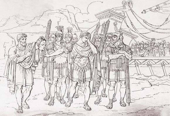 Wkrótce po klęsce pod Farsalos, via Cypr do Egiptu przybył sam Pompejusz, chcąc tam zgromadzić nową armię. Skierował się pod Peluzjum, gdzie na czele armii obozował król, naprzeciwko sił zgromadzonych przez Kleopatrę – w Egipcie również trwała wojna domowa. Podczas narady egipskich dowódców i doradców Ptolemeusza XIII, zapadła decyzja o zabiciu Pompejusza – zadanie to powierzono Gabinianom, którzy wcześniej służyli pod jego dowództwem podczas wschodnich kampanii.