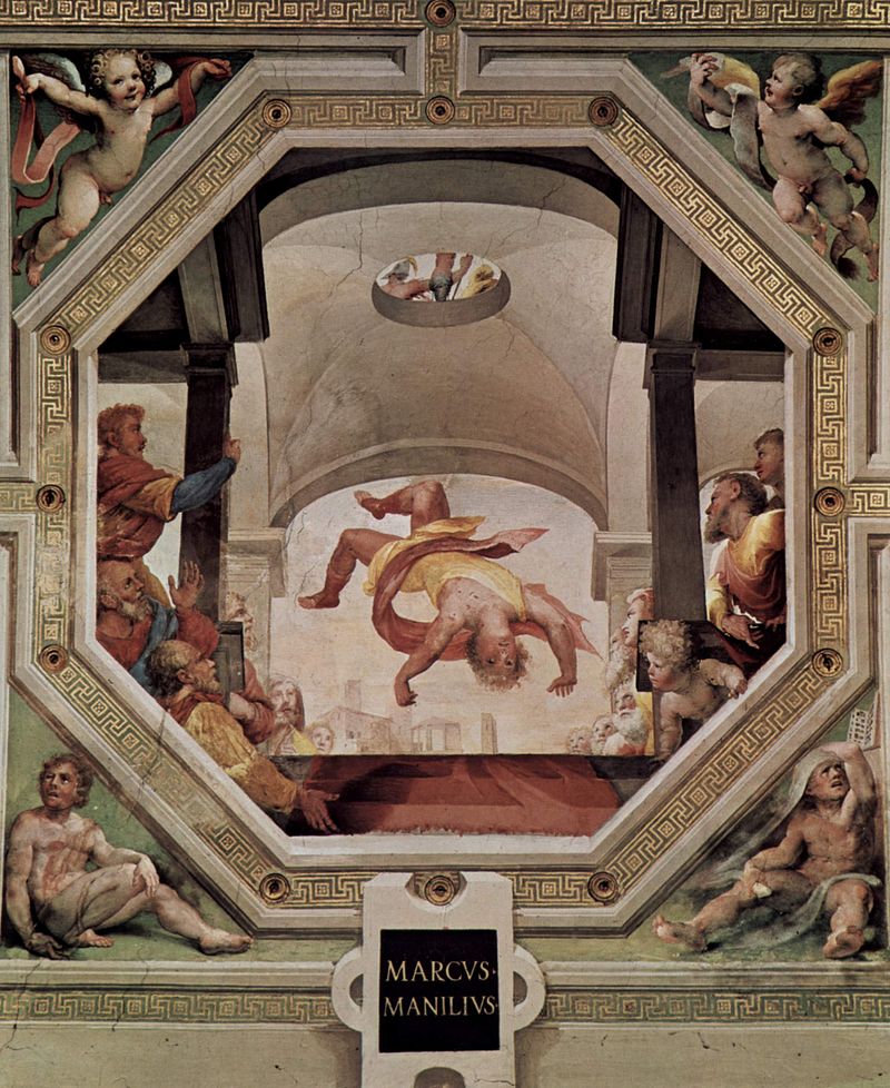 […] bo ich gęganie i trzepot skrzydeł obudziły Marka Manliusza, doskonałego żołnierza, który przed trzema laty był konsulem: chwycił za broń, a jednocześnie budząc innych okrzykiem do broni pobiegł w tym kierunku; inni byli jeszcze ogarnięci przerażeniem, a on uderzył wypukłością tarcz Galla, który już stanął na szczycie, i strącił go w dół. Ten upadając powalił stojących najbliżej niego, innych ogarnęło przerażenie, wypuścili broń, chwycili się rękami skał, których się trzymali, a Manliusz ich pozabijał.