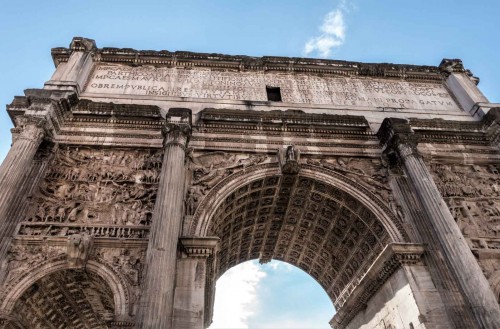 Ten imponujący, trójprzelotowy łuk triumfalny zadedykowany jest cesarzowi Septymiuszowi Sewerowi. Został zbudowany w 203 roku dla upamiętnienia dwóch zwycięskich wypraw władcy przeciwko Partom. Jego środkowa, najwyższa brama miała 12 metrów wysokości i 7 metrów szerokości i znajdowała się bezpośrednio nad via Sacra, drogą prowadzącą do świątyni boga Jowisza na Kapitolu. Nad arkadami bocznymi łuku dojrzymy sceny ukazujące chwalebne wyprawy wojenne cesarza Septymiusza, a właściwie najazdy na cztery miasta – Nisibis w Mezopotamii, Edessę w Azji Mniejszej (od strony Forum) i Seleucję oraz Ktezyfon nad rzeką Tygrys (od strony Kapitolu), którym towarzyszą wizerunki rzymskich bogów i personifikacje pór roku. Całość zdobią piękne kolumny o kompozytowych kapitelach, których bazy dekorowane są do dziś zachowanymi reliefami ukazującymi jeńców wojennych. Na attyce łuku umieszczono w czasach antycznych wykonaną z brązu kwadrygę z cesarzem i jego dwoma synami, powożącymi sześcioma końmi. Cesarz chciał uwiecznić w ten sposób nowe zdobycze terytorialne, które były priorytetem jego panowania, oraz oddać hołd armii, której przewodził, stanowiącej fundament stabilnej polityki dynastycznej, jakiej pragnął dla swych sukcesorów. Wyprawy wojenne dostarczały Rzymowi nie tylko łupów wojennych, podatków i innych darowizn, ale też bardzo ważnego składnika sprawnie działającej gospodarki – niewolników. Armia, stająca się coraz ważniejszym elementem rzymskiej polityki, nigdy przedtem i nigdy później nie była tak liczna. Spokój w niej gwarantowały ciągłe wyprawy, zwycięstwa i łupy wojenne.